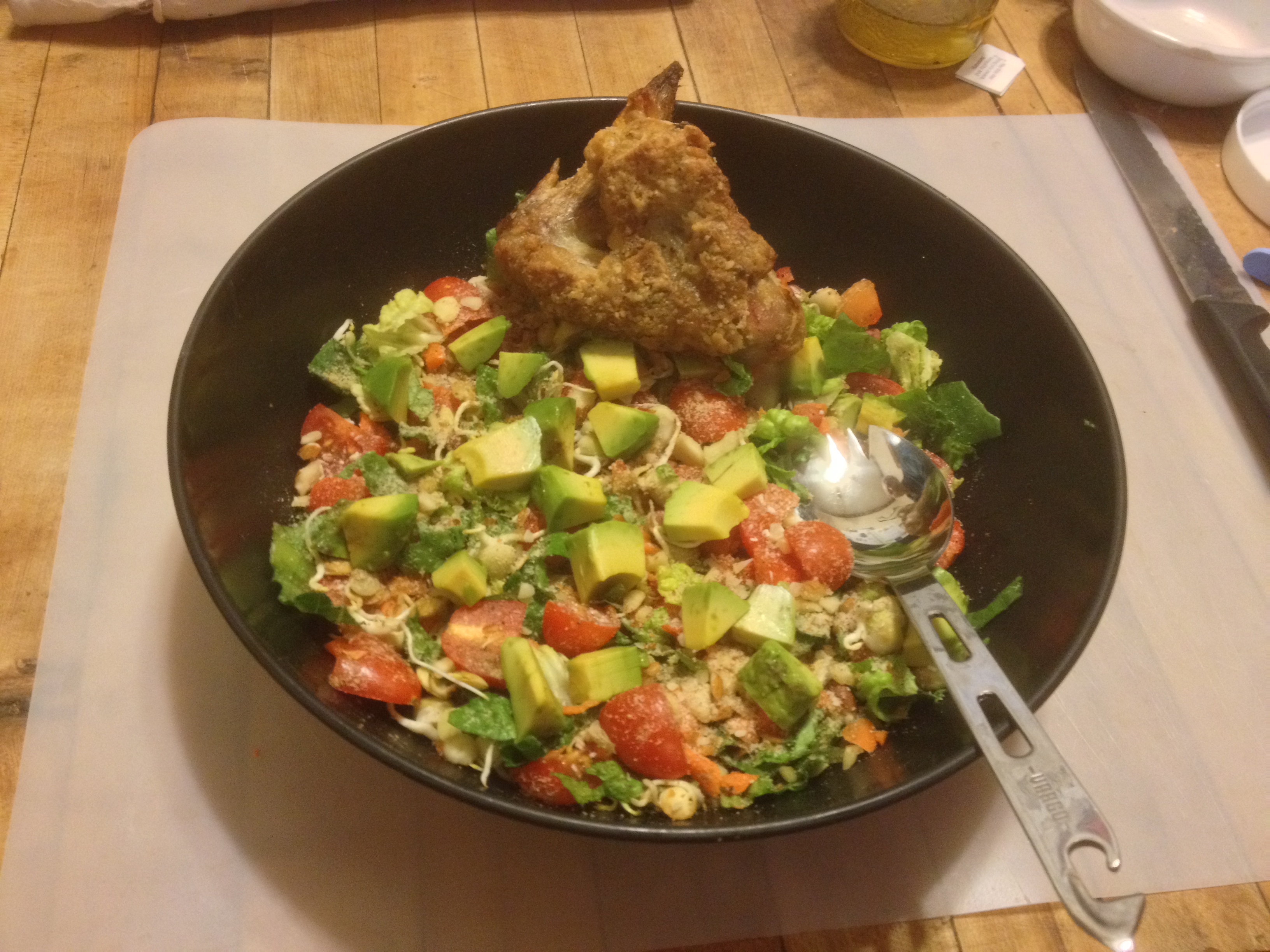 Thank God, too, that my home is the best restaurant in Knoxville! Cheri and I love to cook for ourselves and for each other. The food we make is not only healthy, but insanely delicious and satisfying. (A salad picture below, among the decadent goodies — and a kitchen-gadget photo to remind me to cook more at home.) Helps avoid death by chocolate. But man! those store displays still look good enough to eat.